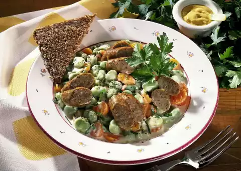 Bring the stock to the boil, add the frozen beans and cook covered for about 15 minutes. Add deep-frozen carrots 5 minutes later and cook at the same time. Heat the oil in a coated pan and fry the sausage for 3 - 4 minutes, turning it over. Take out and cut diagonally into slices. Mix sour cream and starch and stir into the vegetable stock. Bring to the boil briefly. Season to taste with salt and pepper. Wash the parsley and cut into fine strips, except for a little garnish. Fold into the vegetables and arrange on a plate. Add slices of sausage and serve garnished with parsley. Serve with wholemeal bread