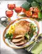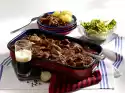Wash parsley and marjoram, dab dry and chop separately, except for something to garnish. Heat 1 tablespoon of oil in a high frying pan and leave the bacon in it until golden brown. Finally add onions, fry briefly and deglaze with stock and cream. Add beans, tomatoes and marjoram, stir in 1 tablespoon of mustard and bring to the boil. Cover and simmer for about 20 minutes. Wash the chops and dab dry. Heat 2-3 tablespoons of oil in a large pan and fry the chops for 5-6 minutes, turning them over. Season with salt and pepper and remove from heat. Drain the potatoes, rinse with cold water and peel.