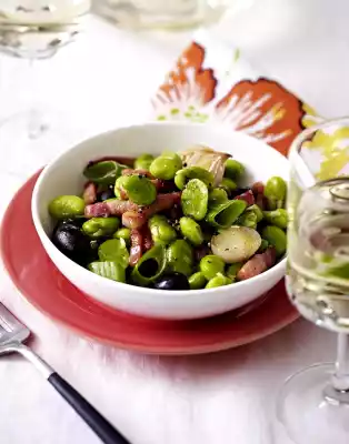 Heat the oil in a pan. Fry the bacon and shallots for about 4 minutes. Add the beans and fry for about 3 minutes. Add spring onion, olive oil and olives, season with salt and pepper. Serve immediately