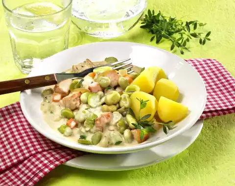 Deglaze with broth, bring to the boil. Add smoked pork loin. Season with pepper and bay leaf. First cook for about 20 minutes at low heat. Peel, wash and halve the potatoes. Cook in salted water for about 20 minutes. Add the beans to the broth and cook for another 10 minutes. Remove the smoked pork and bay leaf from the stock. Cut the smoked pork into cubes and add them again. Stir 4 tablespoons of cream and flour until smooth. Add remaining cream and thyme to the stock and heat. Add the cream while stirring constantly and let it boil for about 2 minutes.
