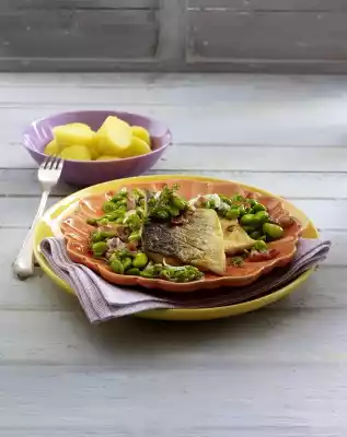 Add bacon to the beans and season with pepper and a little salt. Wash the fish, dab dry and cut the skin thinly. Season fish with salt and pepper and turn it in 2 tablespoons of flour. Tap off excess flour.