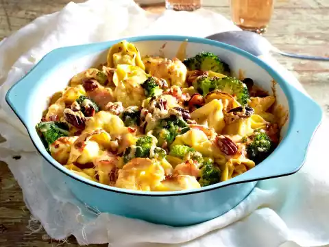 Arrange tortellini, broccoli, nuts, ham and onions in the casserole dish.
