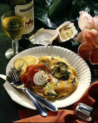 Mix egg yolk, salt and milk. Stir in flour. Beat the egg whites until stiff and fold in carefully. Sauté onion cubes and broccoli florets in portions in hot oil. Add 1/4 dough each and bake to 4 golden brown pancakes.