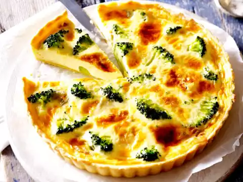 Roll out the dough to a round shape on some flour (approx. 28 cm Ø) and place it in a greased tart tin with a lifting base (approx. 24 cm Ø). Press down the rim. Spread the broccoli and cheese on the tart and pour the egg milk over it. Bake on the lower shelf in a preheated oven (electric oven: 175 °C/circulating air: 150 °C/gas: see manufacturer) for about 30 minutes. Tomato salad tastes good with it.