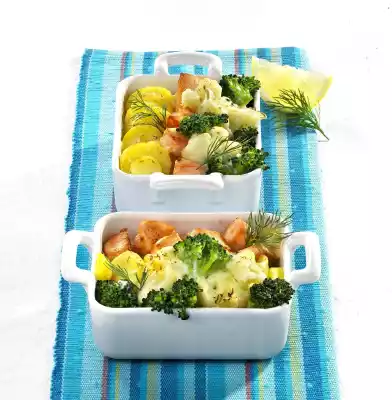 Wash the dill, dab dry and chop finely, except for a little bit for garnishing. Stir dill and lemon juice into the sauce. Season to taste with salt, pepper and sugar. Cut the potatoes into slices. Place potatoes, salmon, cauliflower and broccoli in a greased ovenproof dish or 4 small moulds. Pour bèchamel sauce over them. Bake in the preheated oven (electric cooker: 200 °C/ convection oven: 175 °C/ gas: level 3) for about 12 minutes. Take out and serve garnished with dill