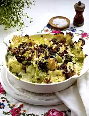 Carefully remove the casserole dish from the oven. Sprinkle bread cube mixture over it and roast it under the hot grill for another 4-5 minutes. Remove, sprinkle with some coarse sea salt and serve immediately.