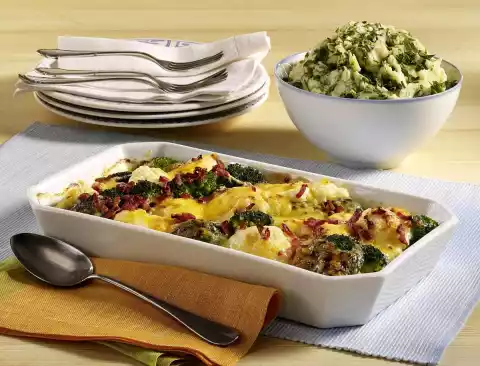 Lightly grease an ovenproof mould. Layer broccoli and cauliflower florets, sprinkle ham strips over it and pour the sauce over it. Sprinkle cheese over the gratin. Bake the gratin in a preheated oven (electric cooker: 200 °C/ convection oven: 175 °C/ gas: level 3) for approx. 35 minutes.