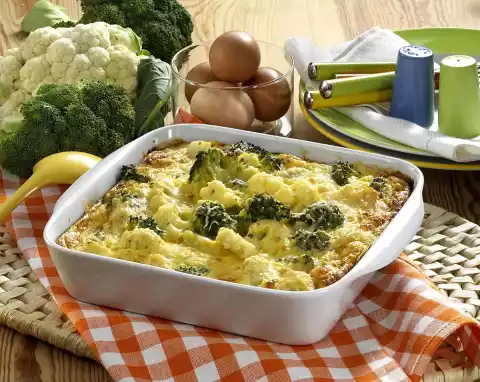 Clean the cauliflower and broccoli, cut into florets and wash. Blanch in bubbling salt water for about 5 minutes. Rinse in cold water and drain. Whisk cream cheese, milk and eggs well.