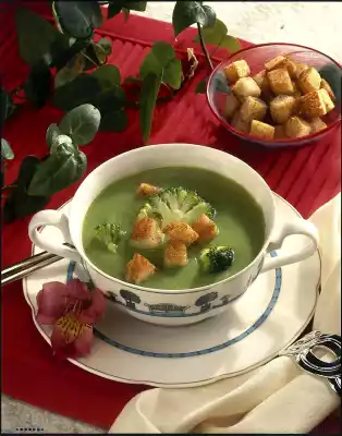 Clean and wash broccoli and cut into florets. Dice broccoli stems. Bring 3/4 litres of water and broth to the boil, add broccoli and cook covered for about 10 minutes. After half of the cooking time, remove some florets with a skimmer. Dice toast, peel garlic and press it through a garlic press.