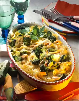 Coarsely chop the almonds and roast them in a pan without fat. Mix the pasta and broccoli, place in an ovenproof dish, pour the sauce over it, sprinkle with the almonds and bake in a preheated oven (electric cooker: 200°C/ gas: level 3) for approx. 20 minutes.
