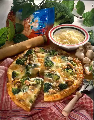 Place on a baking tray lined with baking paper. Mix crème fraîche and season with oregano, salt and pepper. Spread the pizza base with it. Spread broccoli and mushrooms on top and sprinkle with cheese. Drizzle remaining olive oil over it. Bake in the preheated oven (electric oven: 200 °C/ gas: level 3) for 25-30 minutes. Serve cut into pieces