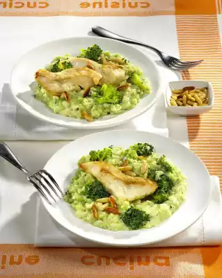 Grate parmesan. Stir the broccoli puree into the risotto about 2 minutes before the end of the cooking time. Fold in the broccoli florets and heat up. Season to taste. Serve with fish. Sprinkle with seeds