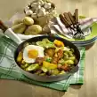 Deglaze with 1/2 litre water. Add broccoli florets and bring to the boil. Cover and cook over low to medium heat for about 20 minutes. 5 minutes before the end of the cooking time add herbs and stir in carefully. Wash the schnitzel and tomatoes and dab dry. Cut the meat into cubes and arrange on 4 skewers alternating with the tomatoes. Heat oil in a pan and fry the skewers for about 5 minutes, turning them over. Coarsely chop the peanuts and finally add them to the hot pan. Season the broccoli risotto with salt and pepper if necessary and distribute on plates. Arrange skewers on top.