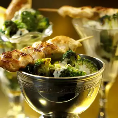 Add the whole broccoli and about 100 ml water to the pan. Bring to the boil, cover and cook for 3-4 minutes. Season to taste. Crush the sesame seeds in a mortar, except for 1 tablespoon. Mix with mayonnaise and soy sauce. (Or mix sesame, mayonnaise and soy sauce briefly with a hand blender.) Drain broccoli. Mix with the sesame sauce. Dab the skewers. Heat 2 tablespoons of oil in a pan. Fry the skewers for 3-4 minutes on each side. Serve with the broccoli salad. Sprinkle with the remaining sesame seeds