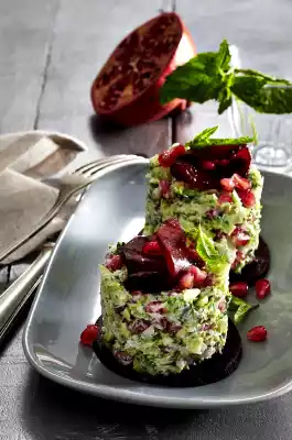 Finely chop the broccoli, mix with cream cheese, pomegranate, shallots and chopped mint, season with salt and pepper. Place the thicker beetroot slices on a large plate or spread 4 small plates.