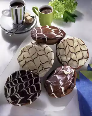 Cream fat, icing sugar, vanillin sugar and salt with the whisk of the hand mixer. Stir in the eggs one after the other. Add milk. Mix flour, cocoa, pudding powder and baking powder and stir in. Using two tablespoons, place 8 heaps on a baking tray lined with baking paper. Bake in the preheated oven (electric cooker: 200 °C/ gas: level 3) for about 12 minutes. Remove from the oven and allow to cool on a rack. Melt the chocolate coating separately in a water bath. Cover one half of the Americans (lower side 8-9 cm Ø) with dark chocolate coating, the other half with white chocolate coating. Fill the rest of the couverture into one small freezer bag each, cut off a small corner. Decorate dark Americans in strips with light chocolate coating. Decorate light Americans with dark chocolate door strips. Gently pull through with a wooden stick. Let the chocolate coating dry