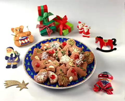 Mix flour, baking powder, sugar, vanillin sugar, almonds and gingerbread spice, place on the work surface and press a depression in the middle, add egg and syrup in the depression and spread fat in flakes on the edge of the flour. Work into a smooth dough with your hands, cover and leave to rest for about 1 hour. Roll out the dough on a floured work surface and cut out cookies with cookie cutters. Place the cookies on a baking tray lined with baking paper, decorate with almonds, pistachios, decorating sugar, cherries and bake in a preheated oven (electric: 200 °C / gas: level 3) for 10-12 minutes. Bake the cookies one after the other, let them cool down and store in tins. Results in approx. 80 pieces