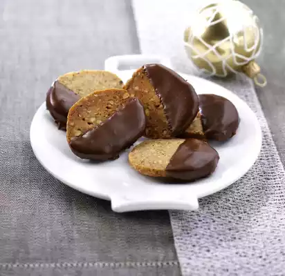 Bake in a preheated oven (electric cooker: 200 °C/ convection oven: 175 °C/ gas: level 3) for 8-10 minutes, remove from oven. Put the cookies on a cake rack and let them cool down. Cut the remaining roll into slices, spread on the baking tray and bake in the same way. Chop the chocolate coating and melt on a warm water bath. Dip half of the cooled biscuits into the chocolate coating and place them back on the rack to dry