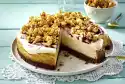 Remove frame carefully. Stir the cream again and spread the cake all around. Carefully spread crunchy beads close together on the cake and dust with gold powder.