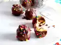 For the sauce, chop 50 g chocolate. Place in a saucepan with 50 g cream and coconut oil. Melt at low heat while stirring. Let cool down for 10-15 minutes.