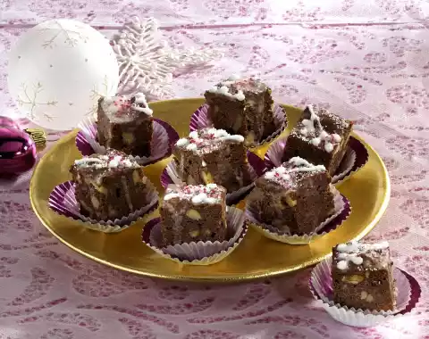 Fill the dough into a square springform pan (24 x 24 cm) lined with baking paper, smooth it down. Bake in a preheated oven (electric cooker: 175 °C/ convection oven: 150 °C/ gas: level 2) for 35-40 minutes. Take out, remove cake from the edge of the tin, let it cool down a little in the tin. Place in the refrigerator for about 1 hour, remove from the mould and cut into 3-4 cm cubes. Mix 50 g icing sugar and rum to a thin icing. Sprinkle brownies with it, let them dry. To decorate, mix 50 g icing sugar and lemon juice to a smooth glaze. Pour into a freezer bag, cut off a small corner. Decorate cookies with it.