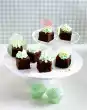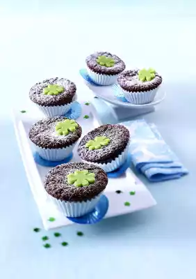 Fill the dough into 2 greased muffin trays (each with 12 troughs) sprinkled with flour. Bake one after the other in a preheated oven (electric oven: 175 °C/ convection oven: 150 °C/ gas: stage 2) for 25-30 minutes. In the meantime, knead the marzipan with approx. 5 g icing sugar and food colouring, roll out and cut out approx. 24 cloverleaves (3.5 cm Ø). Remove the muffins and let them cool down. Dust with approx. 20 g icing sugar. Decorate with cloverleaves