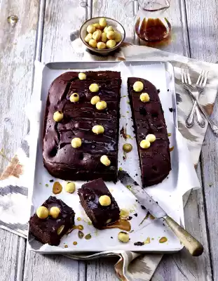 Briefly mix flour, cocoa, sugar, baking powder and milk with the whisk of the hand mixer, fold in 80 g nuts. Pour the dough into a square greased baking tin (24 x 24 cm).