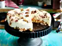 Lightly roast the remaining nuts in a pan without fat, sprinkle with 2 tablespoons of maple syrup. Spread the nuts over the cake and drizzle with the remaining maple syrup.