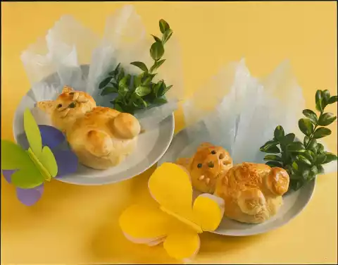 Divide the dough into 12 equally sized pieces. Shape 6 pieces into rabbit bellies. From the remaining pieces of dough form two ears, head and rabbit feet. Brush formed dough with water. Put together as a bunny on a floured baking tray.