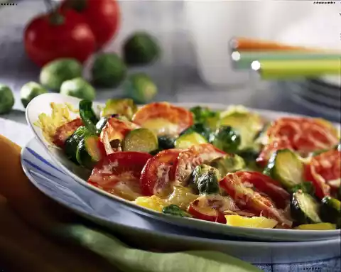 Layer the vegetables alternately in the form, pour crème fraîche over them, sprinkle with cheese and bake in the preheated oven (electric cooker: 225 ° C / gas: level 4) for about 20 minutes.