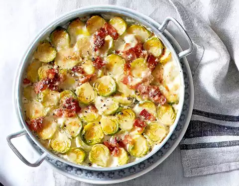 Clean and wash the Brussels sprouts. Blanch in boiling salted water for 2-3 minutes. Drain, rinse with cold water and let drain. Halve the sprouts. Grease two ovenproof gratin dishes (each approx. 20 cm Ø) or a large flat casserole dish.