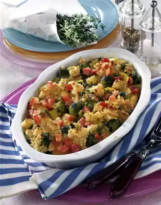 Put everything into a greased ovenproof dish. Whisk eggs, mustard, salt, pepper, nutmeg and milk and pour over the mixture. Bake in the preheated oven (electric oven: 175 °C/ gas: level 2) for approx. 45 minutes.
