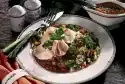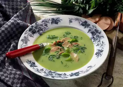 Puree the Brussels sprouts in the stock with the cutting stick of the hand mixer, bring to the boil and stir in potato powder. Add slices of sausage. Season soup with salt, cayenne pepper and nutmeg. Serve sprinkled with the herbs