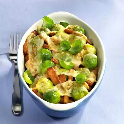 Mix the Brussels sprouts and smoked pork loin in an ovenproof dish. Season with salt, pepper and nutmeg. Cut the cheese into strips and place them on the brussels sprouts and Kasseler mixture. Bake in a preheated oven (electric cooker: 200 °C/ convection oven: 175 °C/ gas: level 3) for 10-15 minutes