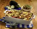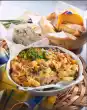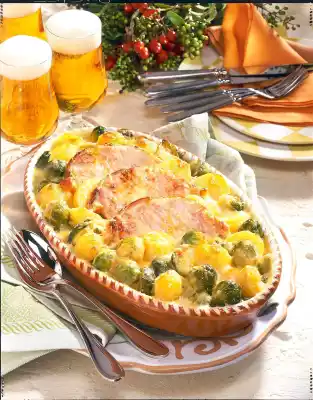 Season to taste with salt and pepper. Put the potatoes and Brussels sprouts in an ovenproof dish. Place slices of sliced pork on top. Pour sauce over them and sprinkle with cheese. Bake in the preheated oven (electric range: 200 ° C/ gas: level 3) for about 20 minutes.