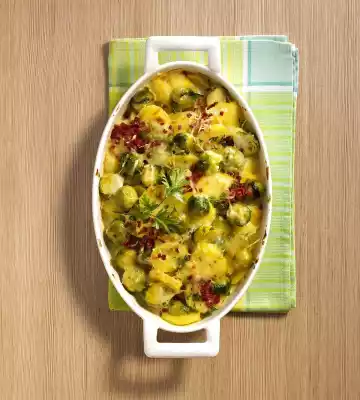 Peel, wash and slice the potatoes. Bring milk and stock to the boil, add potato slices and cook over medium heat for about 15 minutes. Cook Brussels sprouts in boiling salted water for about 10 minutes, drain. Add sprouts to the potatoes, season with salt, pepper and nutmeg. Pour into a greased casserole dish.
