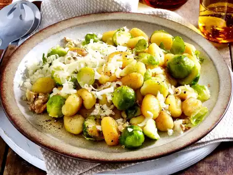 Heat the oil in a frying pan. Fry the gnocchi over medium heat while turning for about 12 minutes. Drain the Brussels sprouts, quench and drain. Depending on size, halve if necessary. Add the sprouts to the gnocchi and fry for approx. 5 minutes.
