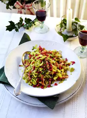 Clean and wash the Brussels sprouts and cut them into fine strips. Cut bacon into strips. Peel shallots and cut into fine rings. Peel garlic and chop finely. Knock out pomegranate seeds with the back of a spoon over a large bowl.