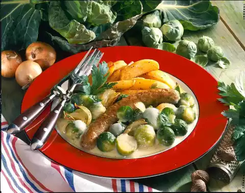 Stir sour cream and flour until smooth. Add to the Brussels sprouts, stir in and bring to the boil again. Season to taste with salt, pepper and nutmeg. Add onion wedges. Arrange potatoes, vegetables and sausages on plates.