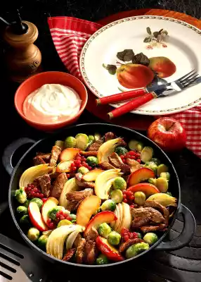 Wash the meat, dab dry and cut into strips. Heat oil in a pan. Brown the meat well in it. Add the onions and apples and fry. Add Brussels sprouts. Season with salt, pepper and paprika.