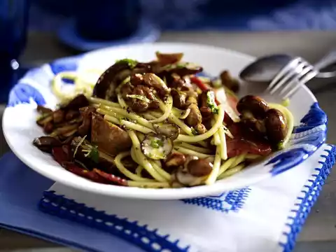 Add butter and fry everything over medium heat for 2-3 minutes. Fold in the bacon mixture and heat up briefly. Stir in lemon juice and parsley mix. Drain the pasta and mix with the mushrooms.