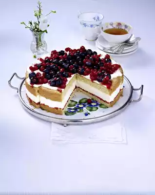 Sort and wash the blueberries. Wash the currants and remove from the panicles. Mix 4 tablespoons of fruit spread with the berries. Remove cake ring. Cut the cake into 12 pieces and spread the berries on top