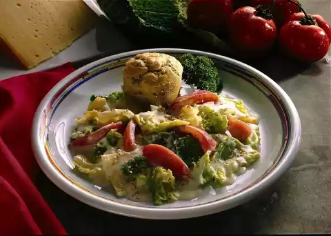 Add stock, remaining cream, cheese and tomatoes to the savoy cabbage and cook for about 5 minutes. Season to taste with salt and pepper. Meanwhile roast the sesame seeds in a dry pan until golden