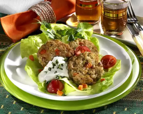 Bake small meatballs from the buckwheat mixture. Cut the cress from the bed. Mix crème légère and cress. Clean and wash lettuce leaves and tomatoes. Arrange buckwheat meatballs with lettuce and tomatoes on plates.