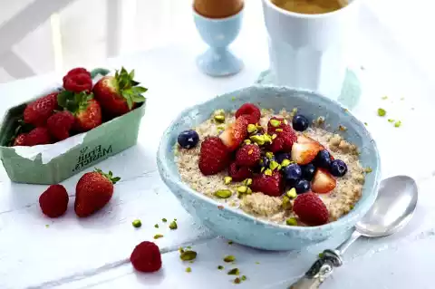 Stir the agave syrup into the porridge. Coarsely chop the pistachios. Divide the porridge into bowls, add the berries and mix with the pistachios.