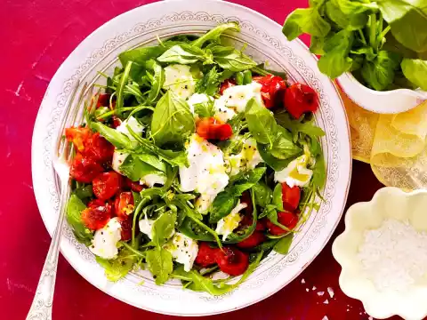 Remove the tomatoes from the oven and let them cool down a little. Mix the rocket, basil and half the vinaigrette. Spread the tomatoes over the salad. Drain cheese, tear up and arrange on the salad. Spread the rest of the vinaigrette over the lettuce.