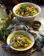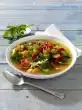 Peel and finely dice the onion and garlic. Clean and wash the bell peppers and spring onions and cut into thin rings. Fry everything briefly in hot oil. Add Bulgur, 1⁄2 l water and broth and bring to the boil.