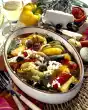 Score the apricots crosswise, blanch briefly and quench. Peel skin and stone the apricots. Dice half the apricots and feta. Mash the rest of the apricots and mix with mustard. Stir apricot and feta cubes and half apricot mustard into the bulgur.