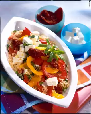 Add spring onions. Season with tarragon, salt, pepper and sugar. Cover and stew for 12-15 minutes. Cut tomatoes and cheese into pieces. Mix all ingredients. Season again with salt and pepper.