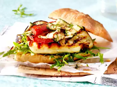 Wash and clean the rocket and drain well. Take the vegetables out of the marinade and let them drip off a little. Spread the rocket on the lower halves of the rolls, place 1 slice of cheese on each and spread the vegetables on top.